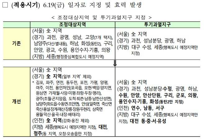 최근 집값 상승이 지속적으로 발생 되고 있는 경기, 인천, 대전, 청주 일부 지역을 제외한 전지역을 조정대상으로 지정한다. 투기 과열이 심각한 경기 10개지역 인전3개, 대전 4개지역을 투기과열지구로 지정했다.